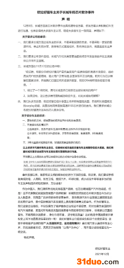 12月14日,对于长城汽车的最终解决方案,欧拉好猫部分车主并不接受,并发表了联合声明,诉求如下:1、更换芯片并给予补偿和终身质保;2、①如不更换芯片则无条件退车并加50%现金赔偿;②如不退车则补偿50%车价现金并提供终身质保、免费保养、8年免费流量;3、最后为三年内置换长城汽车其他车辆,可按照发票价抵扣。
