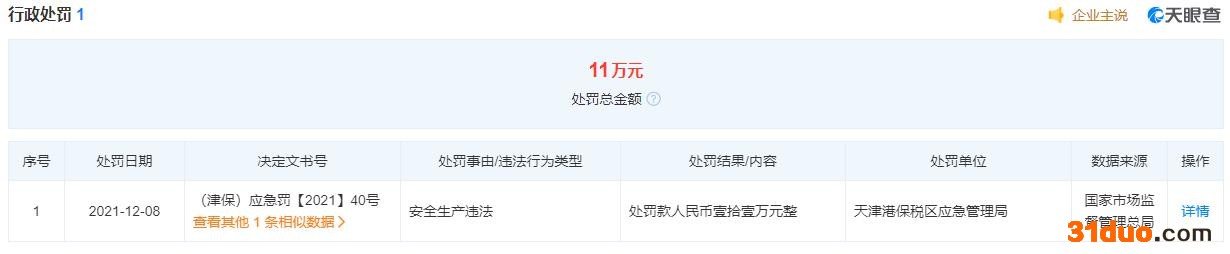中国经济网北京12月22日讯 近日,中国经济网记者看到,天眼查APP上更新信息显示,雪佛龙(天津)润滑油有限公司因安全生产违法被天津港保税区应急管理局罚款11万元。