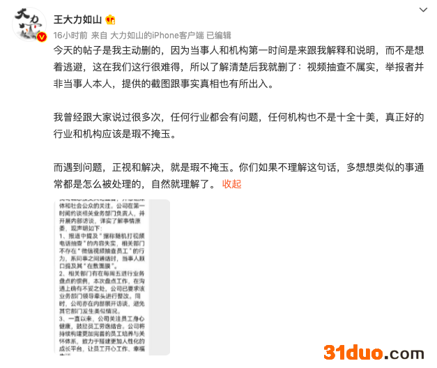 当日下午,爆料者便删除了该内容并表示,“当事人和机构第一时间是来跟我解释和说明,而不是想着逃避,这在我们这行很难得,所以了解清楚后我就删了:视频抽查不属实,举报者并非当事人本人,提供的截图跟事实真相也有所出入。”