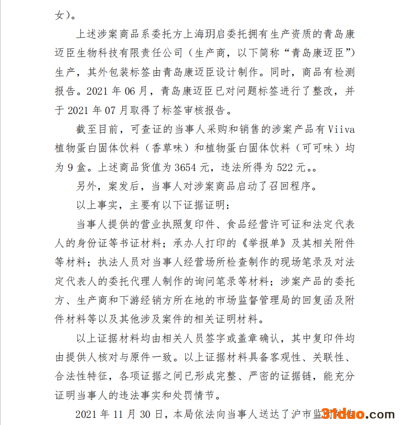 上述涉案商品系委托方上海玥启委托拥有生产资质的青岛康迈臣生物科技有限责任公司(生产商,以下简称“青岛康迈臣”)生产,其外包装标签由青岛康迈臣设计制作。同时,商品有检测报告。2021年6月,青岛康迈臣对问题标签进行了整改,并于2021年7月取得了标签审核报告。截至目前,可查证的安永保健品上海分公司采购和销售的涉案产品有Viiva植物蛋白固体饮料(香草味)和植物蛋白固体饮料(可可味)均为9盒。上述商品货值为3654元,违法所得为522元。