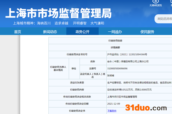 中国网财经12月22日讯(记者 钟文鑫)据上海市市场监管局网站消息,安永(中国)保健品有限公司(简称“安永保健品”)上海分公司近日遭罚2万元,原因是“生产经营标签、说明书不符合法律法规规定的食品、食品添加剂”。