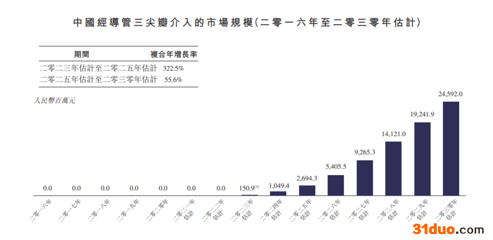 从行业发展来看,预计2023年,中国经导管三尖瓣介入的市场规模将为人民币150.9百万元,预计于二零二五年将达到人民币2,694.3百万元,二零二三年至二零二五年的复合年增长率为322.5%。预计经导管三尖瓣介入的市场规模于二零三零年将达到人民币24,592.0百万元。