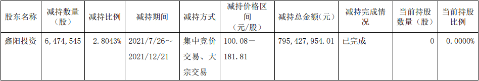近日,公司收到股东鑫阳投资发来的《关于股份减持结果的告知函》,截至2021年12月21日,鑫阳投资通过集中竞价和大宗交易的方式累计减持公司股份647.45万股,占公司总股本的2.8043%,减持价格区间为100.08元/股-181.81元/股,减持总金额为7.95亿元,减持计划已实施完毕。