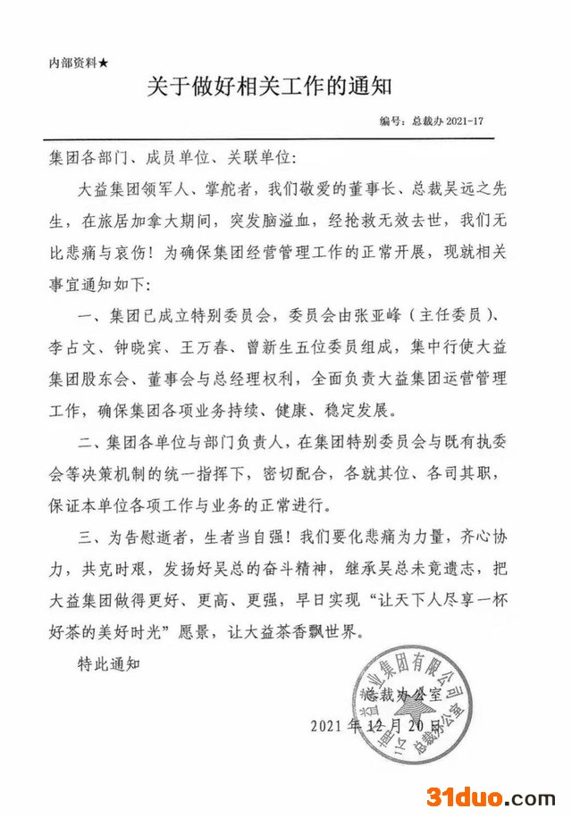 一份落款为大益集团总裁办公室的内部通知文件透露,大益集团已成立特别委员会,委员会由张亚峰(主任委员)、李占文、钟晓宾、王万春以及曾新生五位委员组成,集中行使大益集团股东会、董事会与总经理权利,全面负责大益集团运营管理工作,确保集团各项业务持续、健康、稳定发展。