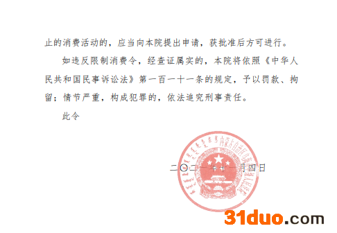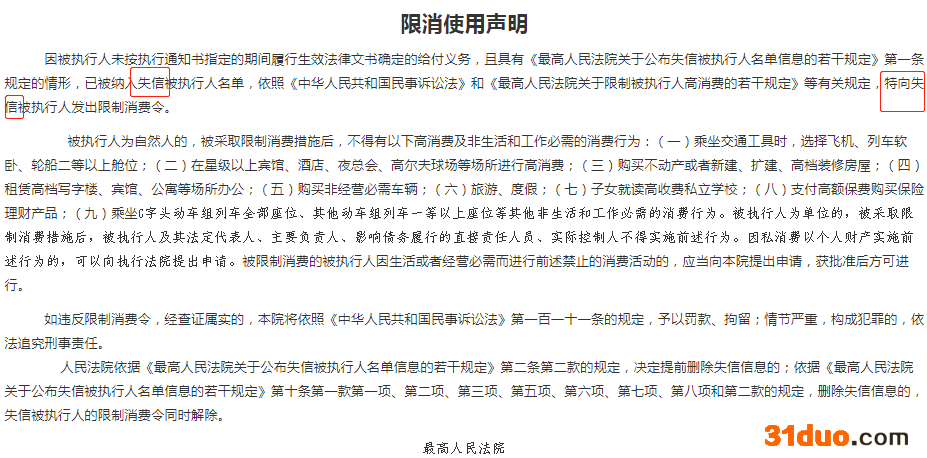 据中国经济网记者了解,因被执行人未按执行通知书指定的期间履行生效法律文书确定的给付义务,且具有《最高人民法院关于公布失信被执行人名单信息的若干规定》第一条规定的情形,已被纳入失信被执行人名单,依照《中华人民共和国民事诉讼法》和《最高人民法院关于限制被执行人高消费的若干规定》等有关规定,特向失信被执行人发出限制消费令。