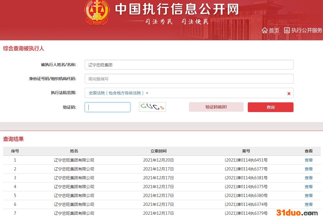 中新经纬12月22日电 据中国执行信息公开网消息,近日,辽宁忠旺集团有限公司新增7条被执行人信息,执行标的总金额超505万元,执行法院均为天津市武清区人民法院。