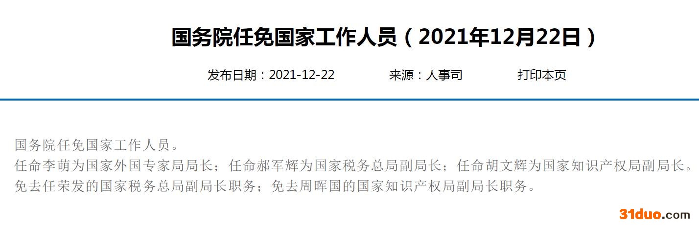 免去任荣发的国家税务总局副局长职务;免去周晖国的国家知识产权局副局长职务。