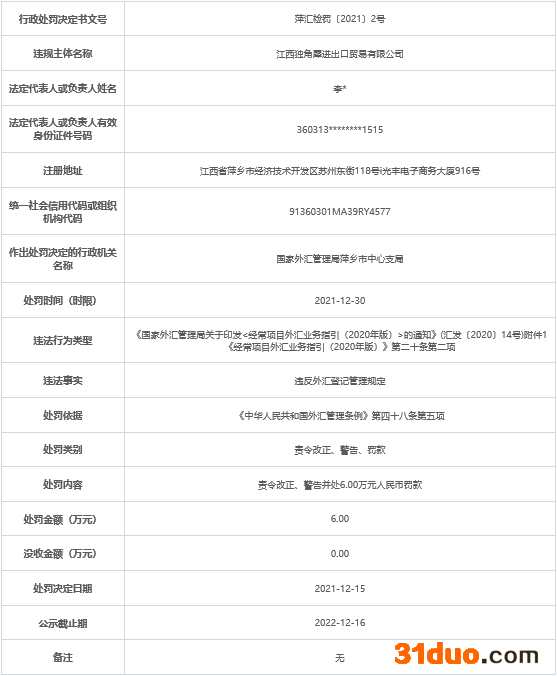中国经济网北京12月22日讯国家外汇管理局网站近日公布的行政处罚决定书(萍汇检罚〔2021〕2号)显示,江西独角犀进出口贸易有限