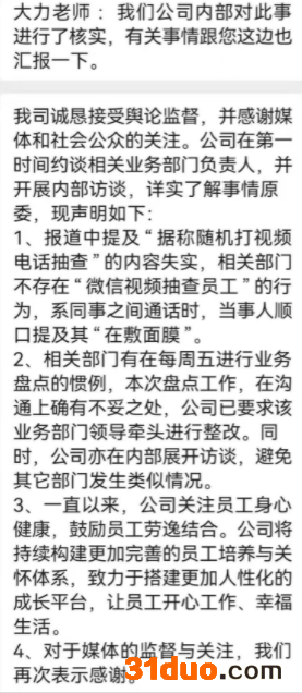 对此,五矿证券发声明回应称,报道中提及“据称随机打视频电话抽查”的内容失实,相关部门不存在“微信视频抽查员工”的行为,系同事之间通话时,当事人顺口提及其“在敷面膜”。相关部门有在每周五进行业务盘点的惯例,本次盘点工作,在沟通上确有不妥之处,公司已要求该业务部门领导牵头进行整改。同时,公司亦在内部展开访谈,避免其它部门发生类似情况。
