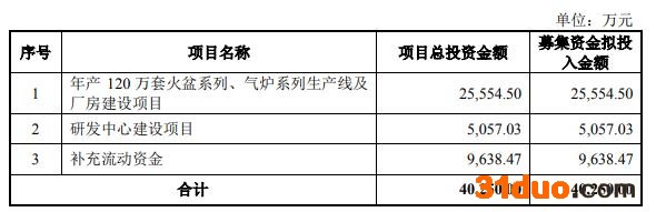 雅艺科技本次发行募集资金总额为5.46亿元,募集资金净额为4.93亿元。公司最终募集资金净额比原计划多0.9亿元。雅艺科技于12月8日披露的招股说明书显示,公司拟募集资金4.03亿元,分别用于年产120万套火盆系列、气炉系列生产线及厂房建设项目;研发中心建设项目;补充流动资金。