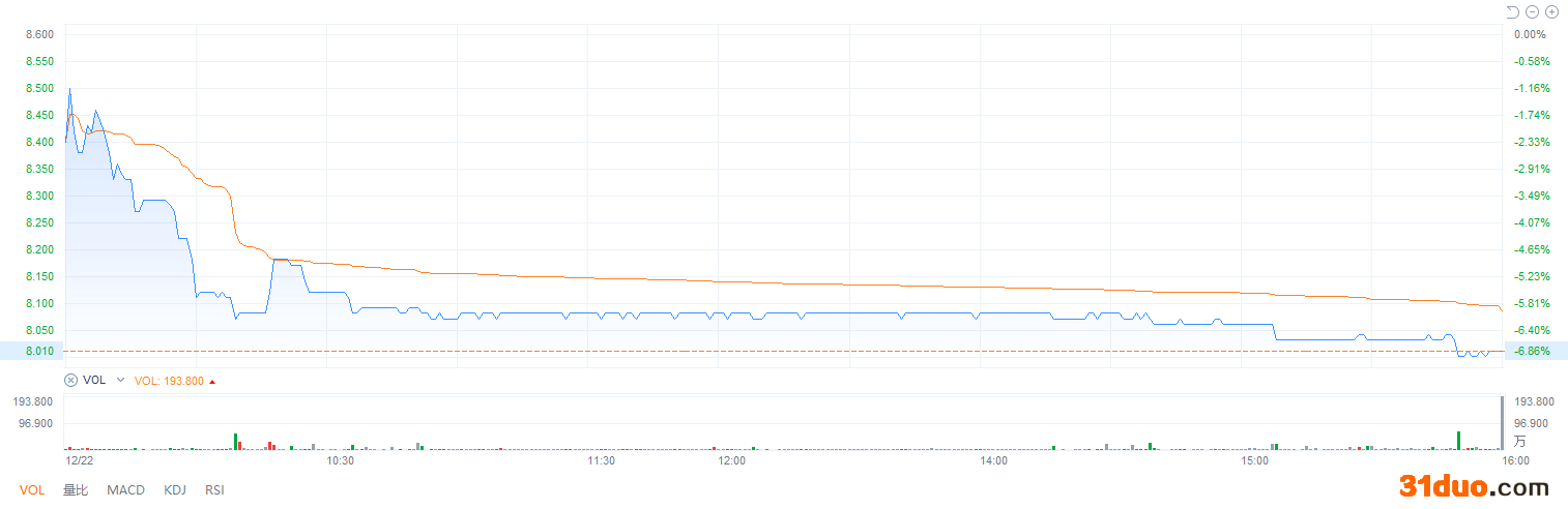 周三(12月22日)开盘后,滔搏不出意外地低开低走,报收8.0港元,跌6.86%。