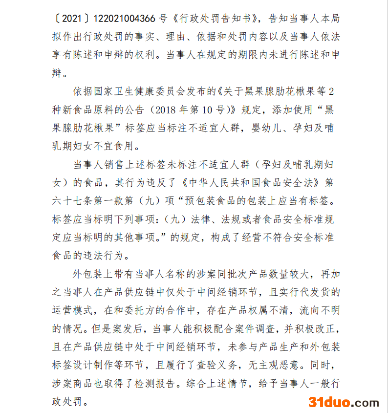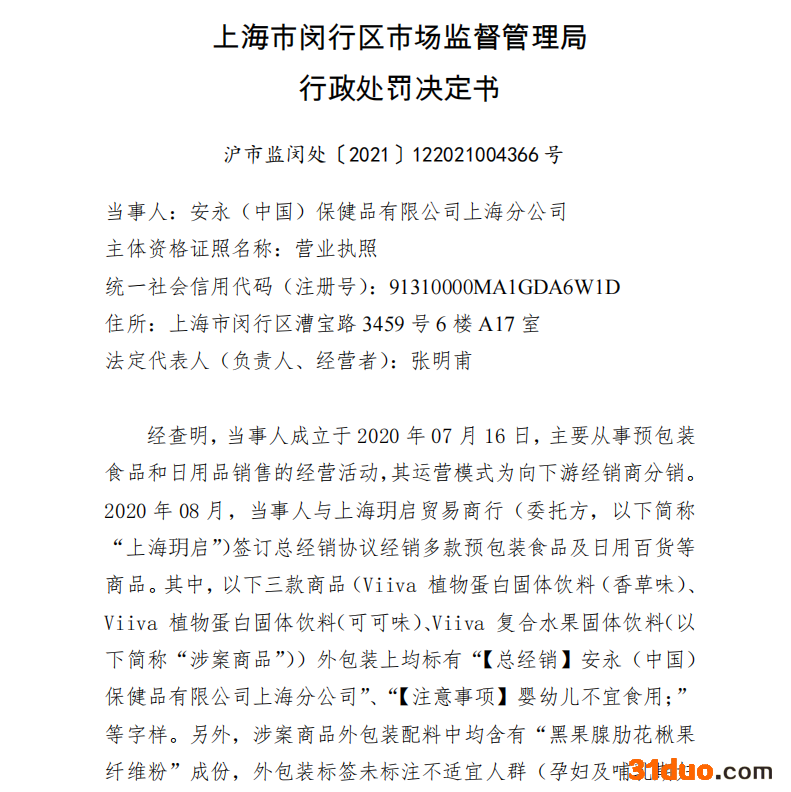 行政处罚决定书显示,安永保健品上海分公司成立于2020年7月16日,主要从事预包装食品和日用品销售的经营活动,其运营模式为向下游经销商分销。2020年8月,安永保健品上海分公司与上海玥启贸易商行(委托方,以下简称 “上海玥启”)签订总经销协议经销多款预包装食品及日用百货等商品。其中,以下三款商品(Viiva 植物蛋白固体饮料(香草味)、Viiva 植物蛋白固体饮料(可可味)、Viiva 复合水果固体饮料(以下简称“涉案商品”))外包装上均标有“【总经销】安永(中国)保健品有限公司上海分公司”、“【注意事项】婴幼儿不宜食用;”等字样。另外,涉案商品外包装配料中均含有“黑果腺肋花楸果纤维粉”成份,外包装标签未标注不适宜人群(孕妇及哺乳期妇女)。
