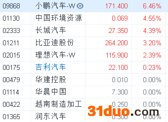 汽车板块的其他个股今日亦有不错的表现,其中长城汽车(02333.HK)和比亚迪股份(01211.HK)涨幅均超3%。