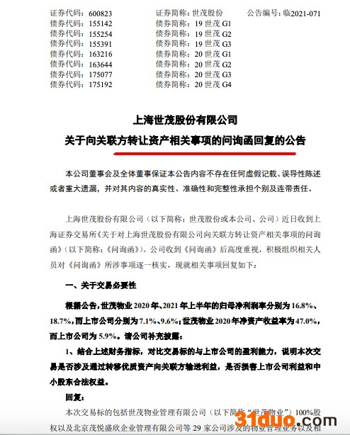 中华网财经12月22日讯:上海世茂股份有限公司(简称:世茂股份,600823.SH)回复上交所此前《关于对上海世茂股份有限公司向关联方转让资产相关事项的问询函》称,世茂股份拟以约16.54亿元,将所属的物业管理相关公司、资产、负债和业务全部出售给世茂服务控股有限公司,交易标的包括世茂物业管理有限公司100%股权、北京茂悦盛欣企业管理有限公司等29家公司涉及的物业管理业务以及相关的资产负债。其转让物业管理业务资产交易,并不涉及“转移优质资产向关联方输送利益,不存在损害上市公司利益和中小股东合法权益”的情形。