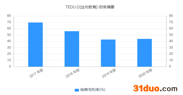 在毛利方面,2017年-2020年,达内科技毛利分别为13.75亿元、11.67亿元、8.78亿元及8.31亿元;同比增长率分别为22%、-15%、-25%、-5%,呈现持续下滑态势;毛利率分别69.64%、55.95%、42.78%、43.79%。