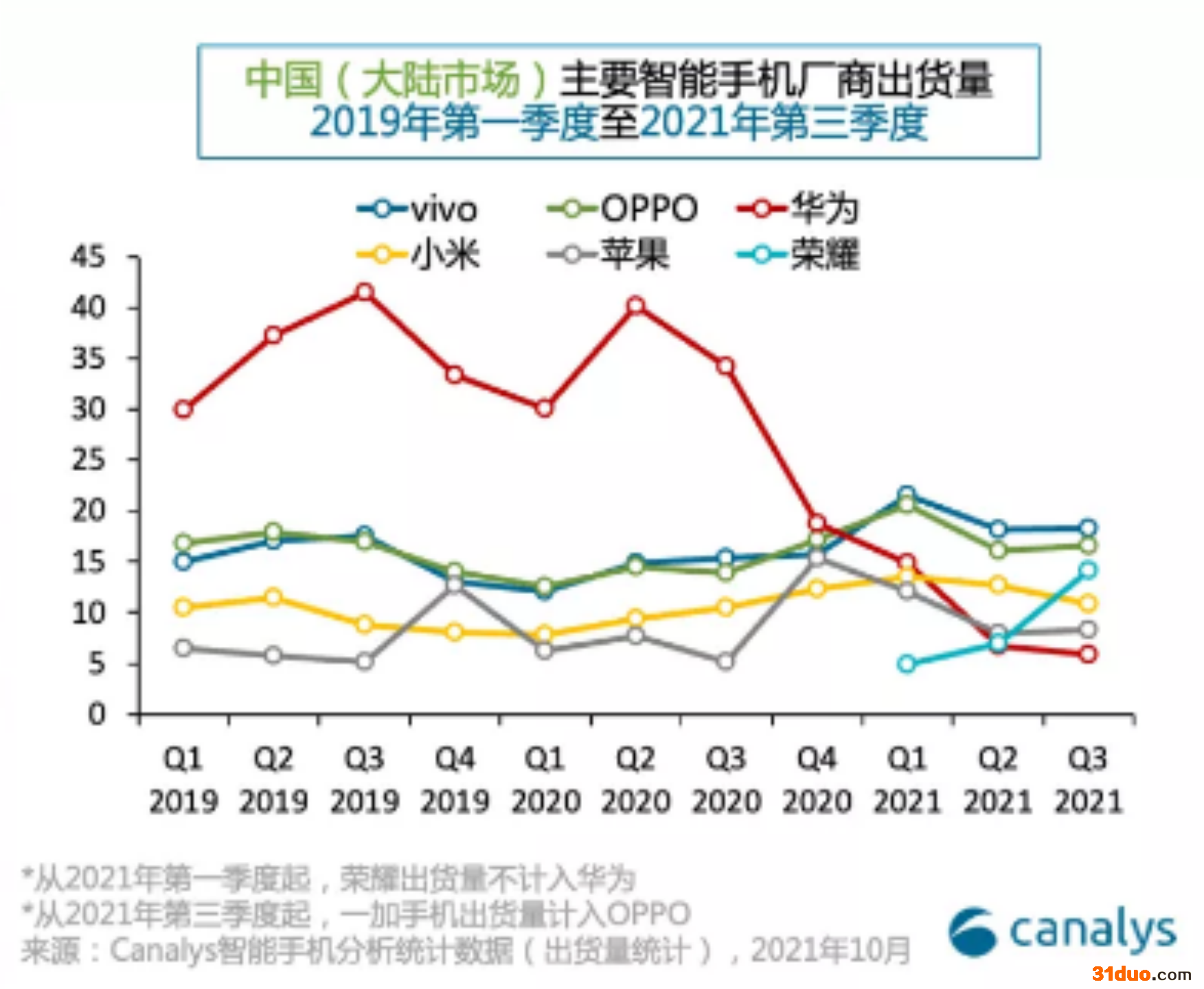 自6月起的第三季度,荣耀推出了荣耀50系列、荣耀Magic3系列等新机。