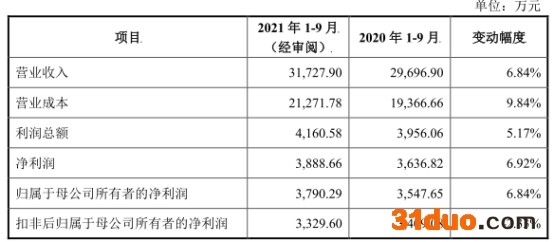 2021年1-9月,公司实现营业收入3.17亿元,同比增长6.84%;实现归属于母公司所有者的净利润3790.29万元,同比增长6.84%;实现扣非后归属于母公司所有者的净利润3329.60万元,同比减少2.33%;经营活动产生的现金流量净额61.55万元,同比减少98.95%。