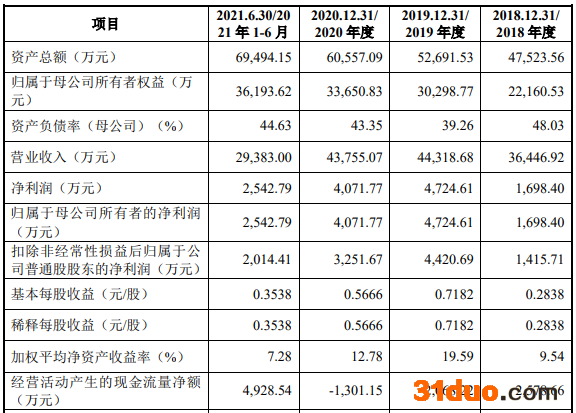 2021年1-9月,公司营业收入、净利润、扣非后净利润分别为4.63亿元、4444.76万元、3639.93万元,较2020年同期上涨幅度分别为65.78%、74.65%、97.73%。