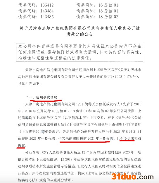 就违规事实,公告中天房信托表示,公司先后于2016年、2018年公开发行多只公司债券,根据相关规定,公司应于8月31日前披露2021年中期报告,但其未能按时披露,且至今仍未完成。