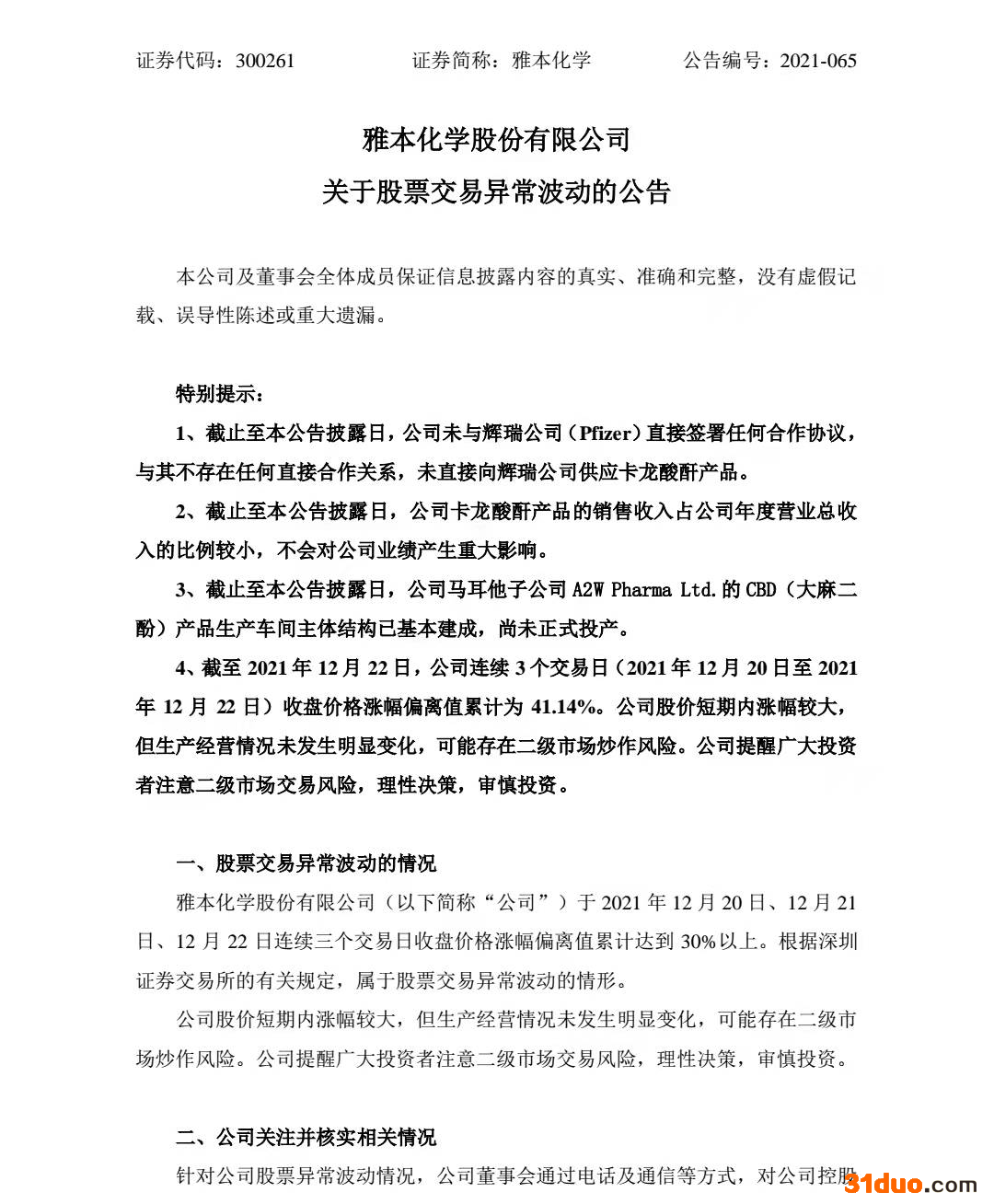12月22日晚,雅本化学发布股票交易异常波动公告称,近期公司经营情况及内外部经营环境未发生重大变化。截至目前公司未与辉瑞公司直接签署任何合作协议,与其不存在任何直接合作关系,未直接向辉瑞公司供应卡龙酸酐产品。