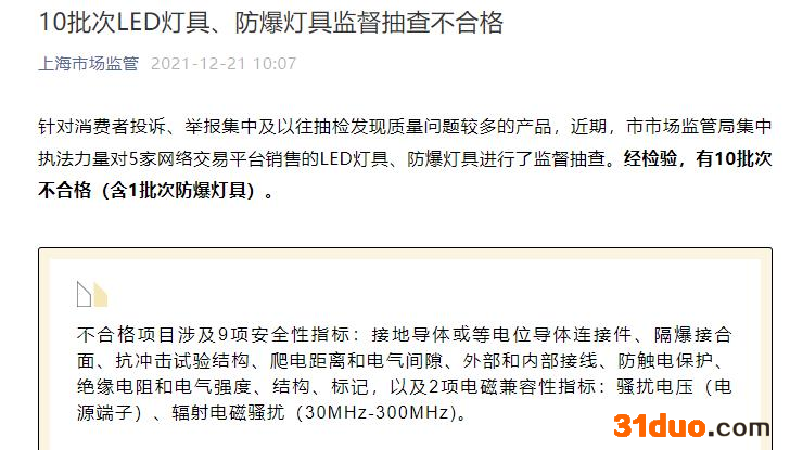 中国经济网北京12月23日讯 上海市场监管微信公众平台日前公布的《10批次LED灯具、防爆灯具监督抽查不合格》信息显示,针对消费者投诉、举报集中及以往抽检发现质量问题较多的产品,近期,市市场监管局集中执法力量对5家网络交易平台销售的LED灯具、防爆灯具进行了监督抽查。经检验,有10批次不合格(含1批次防爆灯具)。