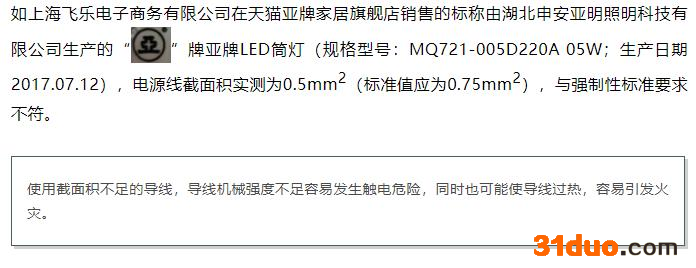 其中,有1批次外部和内部接线不合格。如上海飞乐电子商务有限公司在天猫亚牌家居旗舰店销售的标称由湖北申安亚明照明科技有限公司生产的亚牌LED筒灯(规格型号:MQ721-005D220A 05W;生产日期2017.07.12),电源线截面积实测为0.5mm2(标准值应为0.75mm2),与强制性标准要求不符。