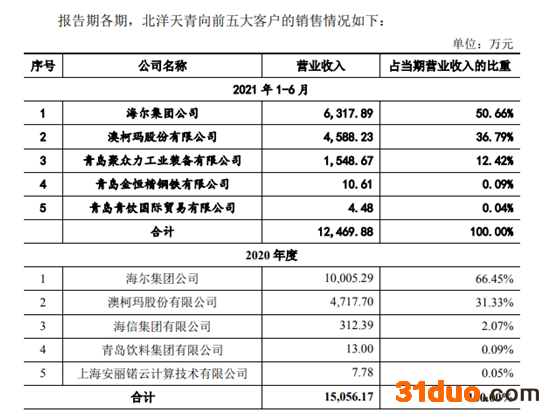 事实上,北洋天青还是存在不少问题,例如主要客户销售集中度较高。2020年及2021上半年,北洋天青的营业收入全部来自前五大客户,主要客户包括海尔、澳柯玛等公司。