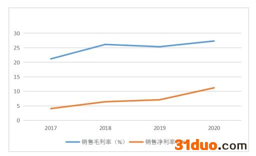从图中分析得出,正帆科技从2017年到2020年销售毛利率和净利率有了显著的提升,尤其是净利率提升较为明显,公司的盈利能力越来越强。
