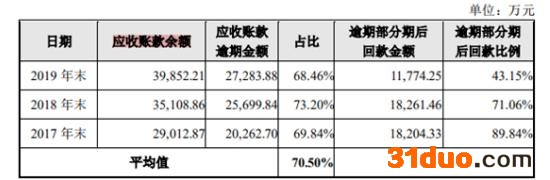 正帆科技报告期各期末存在逾期情况,且占比较大,2019年末应收账款逾期金额约2.7亿元,占应收账款余额的68.46%,逾期部分期后回款金额约1.2亿元,回款比例约43.15%。
