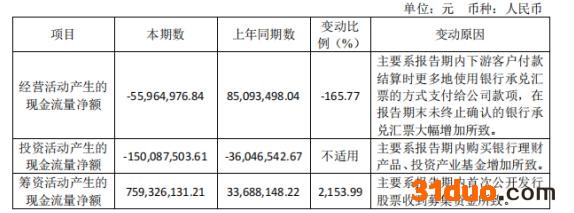 经营活动产生的现金流量净额较去年同期减少 165.77%,主要原因系报告期内下游客户付款结算时更多地使用银行承兑汇票的方式支付给公司款项,在报告期末未终止确认的银行承兑汇票大幅增加所致。
