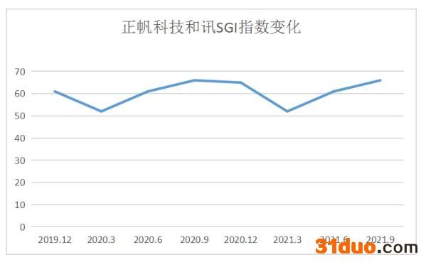 正帆科技和讯SGI指数评分出炉,公司获得66分,从图中可以清楚的看出,公司在近8个季度得分较平均。得分维持在50-70分之间。反映出公司发展萎靡不振。