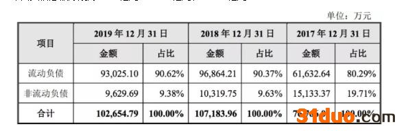 现金流捉襟见肘,近年来正帆科技的负债额也大幅飙升,连续多年超过10亿元。2017-2019年其负债总额分别为7.68亿元、10.72亿元和10.27亿元。
