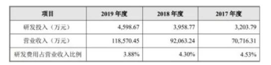 2017年至2019年,正帆科技的研发费用分别为3203.79万元、3958.77万元、4598.67万元。正帆科技的研发费用率逐年下滑,2017年至2019年,正帆科技的研发费用率分别为4.53%、4.30%、3.88%。