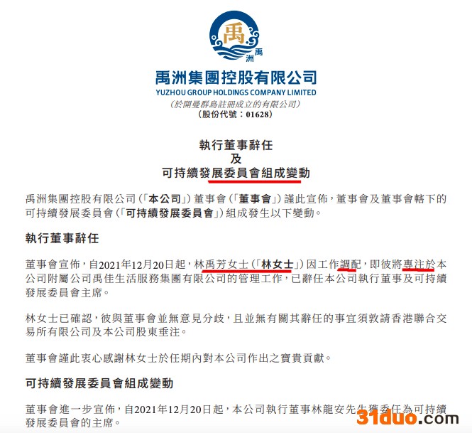 具体而言,12月20日,禹洲集团公告表示,自2021年12月20日起,林禹芳因工作调配,即彼将专注于禹洲集团附属公司禹佳生活服务集团有限公司的管理工作,已辞任公司执行董事及可持续发展委员会主席。
