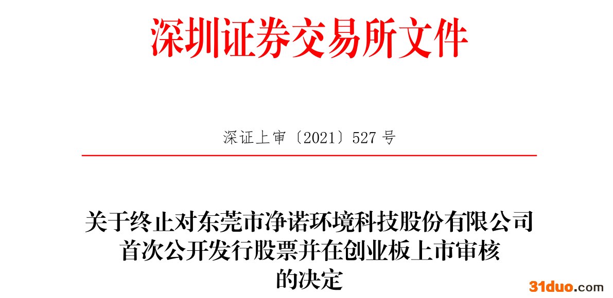 2021年12月20日,东莞市净诺环境科技股份有限公司向深交所提交了《关于撤回东莞市净诺环境科技股份有限公司首次公开发行股票并在创业板上市申请文件的申请》,保荐人东兴证券股份有限公司向深交所提交了《关于撤回东莞市净诺环境科技股份有限公司首次公开发行股票并在创业板上市申请文件的申请》。根据《深圳证券交易所创业板股票发行上市审核规则》第六十七条的有关规定,深交所决定终止对公司首次公开发行股票并在创业板上市的审核。
