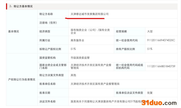 转让方天津泰达城市发展集团有限公司为国有独资企业(公司)/国有全资企业,市级国资委监管。