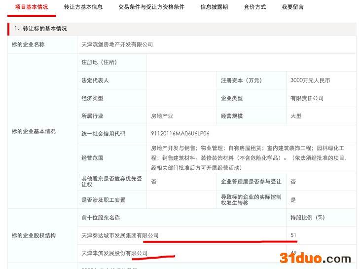 中华网财经12月23日讯:据全国产权行业信息化综合服务平台消息,天津泰达城市发展集团有限公司拟转让天津滨堡房地产开发有限公司51%股权,底价1843万元。