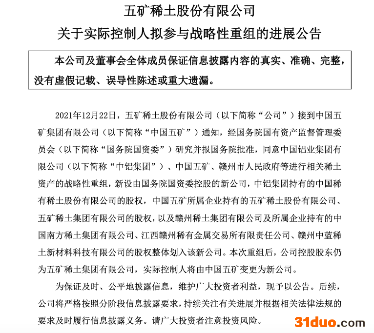 中华网财经讯,12月22日晚间,五矿稀土股份有限公司(下称五矿稀土,000831.SZ)公告称,公司于当日接到中国五矿集团有限公司(下称中国五矿)通知,经国务院国资委研究并报国务院批准,同意中铝集团、中国五矿以及赣州市人民政府等进行稀土资产战略性重组,新成立公司由国务院国资委控股。