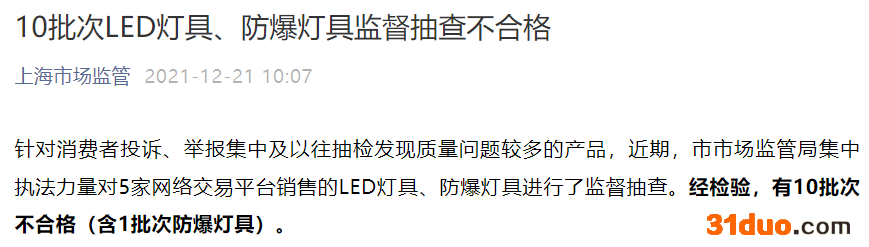 中国经济网北京12月23日讯 12月21日,上海市场监督管理局微信公众号“上海市场监管”发布了文章《10批次LED灯具、防爆灯具监督抽查不合格》。针对消费者投诉、举报集中及以往抽检发现质量问题较多的产品,近期,上海市市场监管局集中执法力量对5家网络交易平台销售的LED灯具、防爆灯具进行了监督抽查。经检验,有10批次不合格(含1批次防爆灯具)。