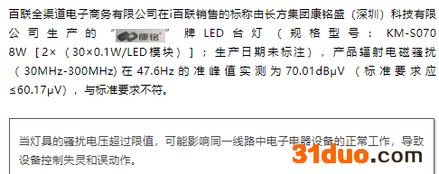 其中,百联全渠道电子商务有限公司在i百联销售的标称由长方集团康铭盛(深圳)科技有限公司生产的“康铭”牌LED台灯(规格型号:KM-S070 8W[2×(30×0.1W/LED模块)];生产日期未标注),标记、辐射电磁骚扰(30MHz-300MHz)项目不合格。该批次产品辐射电磁骚扰(30MHz-300MHz)在47.6Hz的准峰值实测为70.01dBμV(标准要求应≤60.17μV),与标准要求不符。