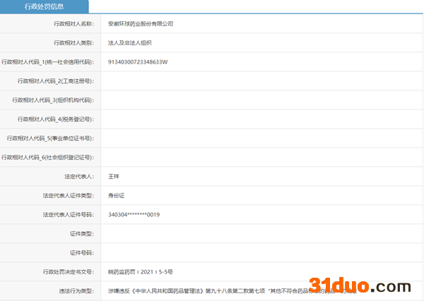 中国网财经12月23日讯 日前,安徽省药监局发布一则关于安徽环球药业股份有限公司的行政处罚信息(皖药监药罚﹝2021﹞5-5号)。