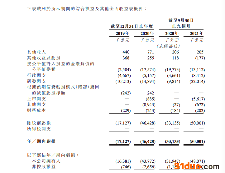 不过,值得注意的是,该公司目前并无商业化产品,收入主要靠政府补助及存款利息。2019年、2020年及今年前九个月,公司累计亏损1.14亿美元。具体来看,2020年净亏损4643万美元,同比扩大近两倍;今年上半年亏损5000万美元,已经超过2020年亏损总额,主要原因是研发开支激增。