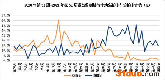 而克而瑞统计的重点监测城市的拿地数据显示,地市场低热度的态势仍在延续,重点监测城市的成交溢价率已连续17周处于5%的低位。流拍情况较三季度末、四季度初的高峰期已有所缓和,但较往年比仍然较高。