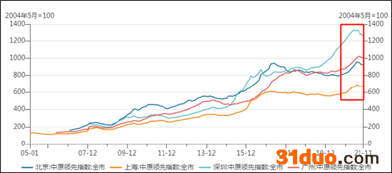 中原地产二手住宅价格指数显示,在经历上一轮(2017.04-2020.01)调整后,风向标的北上广深二手房价格指数迎来一波较大的涨幅。而从今年下半年开始,4大一线城市的二手房价格指数均出现回调,而这个调整周期较以往相比,明显才刚开始。按照过去的数据经验,这轮调整少则一年,长则3年。