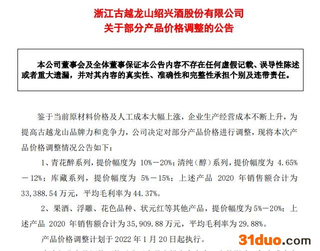 其中,青花醉系列,提价幅度为10%-20%;清纯(醇)系列,提价幅度为4.65%-12%;库藏系列,提价幅度为5%-15%;上述产品 2020年销售额合计为33388.54万元,平均毛利率为44.37%。此外,果酒、浮雕、花色品种、状元红等其他产品,提价幅度为5%-20%;上述产品2020年销售额合计为35909.88万元,平均毛利率为29.88%。产品价格调整计划于2022年1月20日起执行。