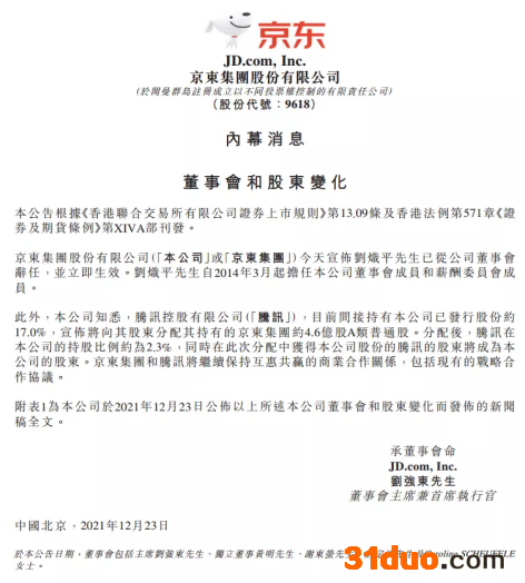 腾讯、京东双双公告!腾讯向股东派发1000亿元京东股票,不再为京东第一大股东,腾讯总裁刘炽平卸任京东董事 2021-12-24 08:42 来源:每日经济新闻