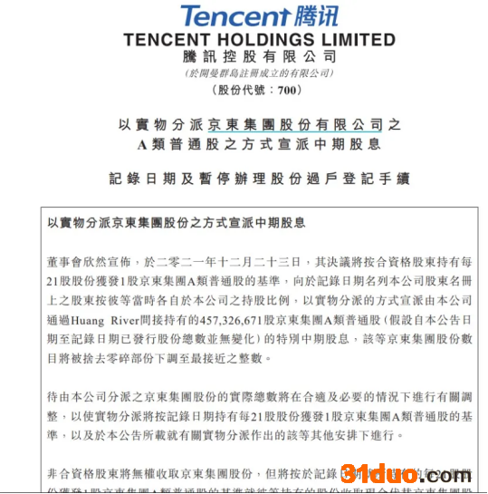 根据腾讯公告的派息安排,合资格股东持有每21股股份,将获得1股京东集团A类普通股。非合资格股东将无权收取京东集团股份,但将按于记录日期就所持有的每21股股份获发1股京东集团A类普通股的基准就彼等持有的股份收取现金代替京东集团股份。