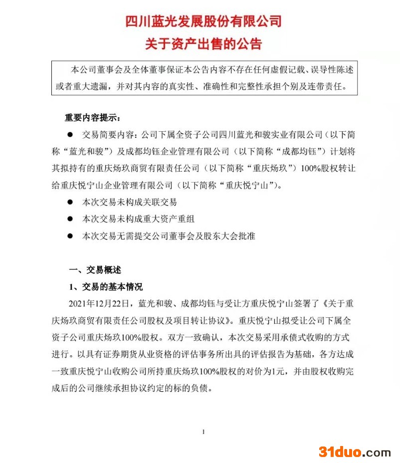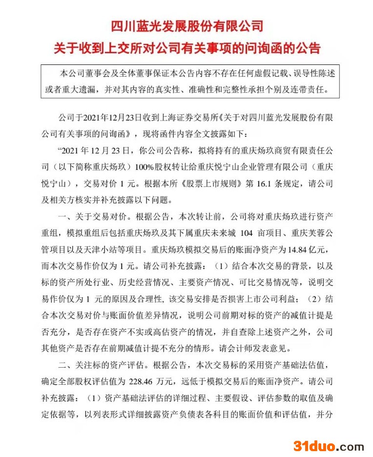 12月23日晚,蓝光发展发布公告称,公司下属子公司拟出让重庆炀玖商贸公司100%的股权,交易对价为1元。公告刚刚发布,公司就收到了上交所的问询函,要求公司说明交易对价仅为1元的合理性及其他交易事项。