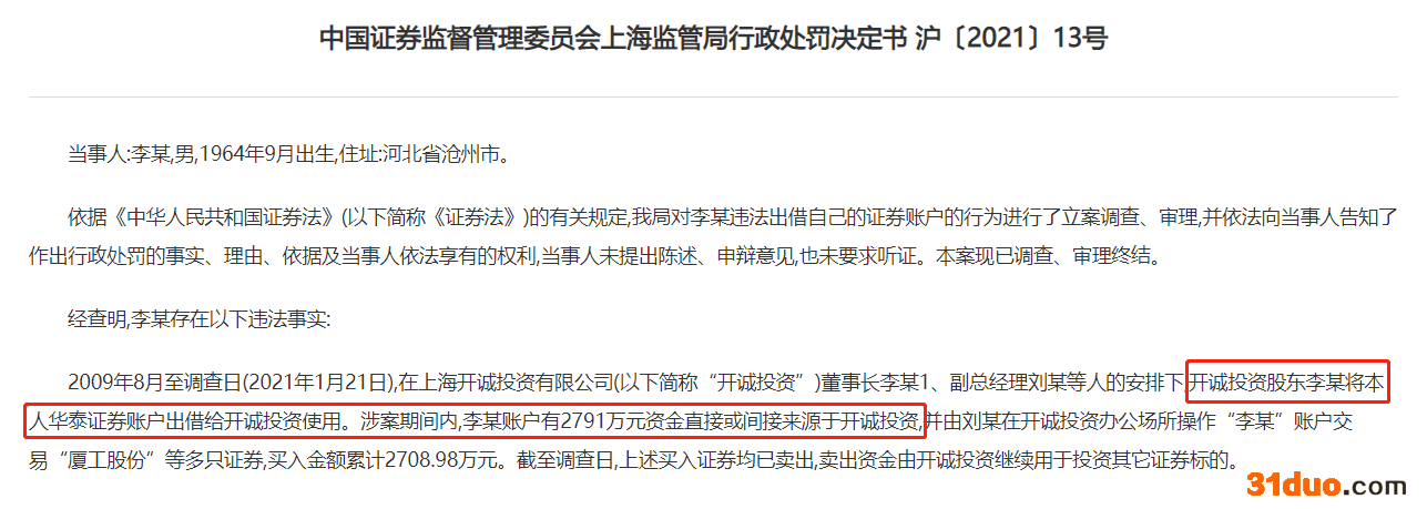 上海证监局日前一口气发布3张行政处罚决定书,开诚投资违法借用他人证券账户,以及李某和李某鑫违法出借自己的证券账户给开诚投资使用。上海证监局不仅对借用证券账户的开诚投资进行处罚,为出借账户的李某和李某鑫亦同时开出罚单。