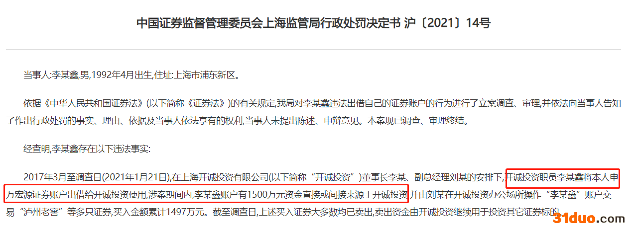 据上海证监局调查,李某为开诚投资股东,2009年8月至调查日(2021年1月21日)期间,李某将本人华泰证券账户出借给开诚投资使用。涉案期间内,李某鑫账户有1500万元资金直接或间接来源于开诚投资,并由刘某在开诚投资办公场所操作“李某鑫”账户交易“泸州老窖”等多只证券,买入金额累计1497万元。
